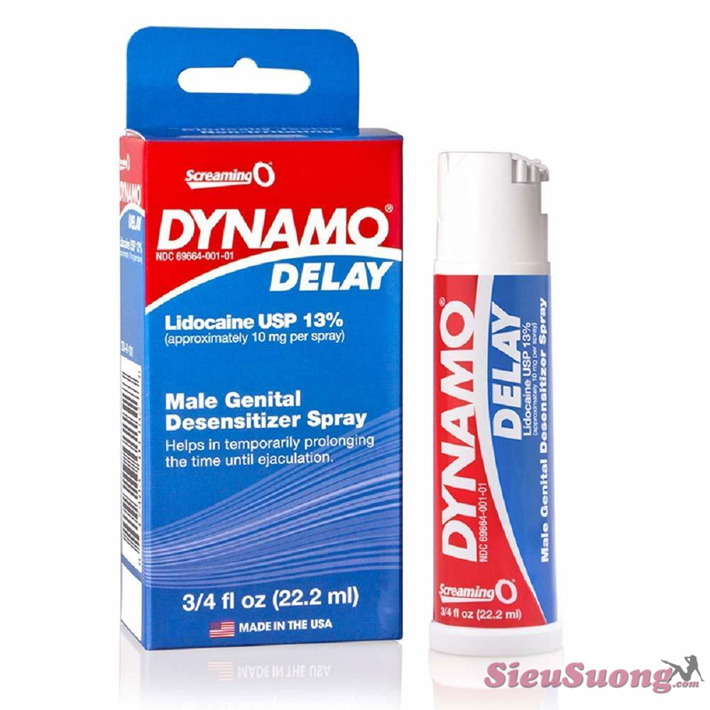 Với chai xịt Dynamo nhập khẩu Mỹ kéo dài thời gan quan hệ là chai xịt kéo dài thời gian quan hệ tình dục và ngăn xuất tinh sớm về lâu dài đồng thời tăng cường khả năng cương cứng khi quan hệ cho “cậu nhỏ”. Với công thức đặc biệt Dynamo Delay chứa tới 13% hoạt chất lidocain có tác dụng như chất gây tê tạm thời làm giảm hưng phấn và khoái cảm ở phần đầu dương vật. Chính vì thế khi sử dụng chai xịt Dynamo Delay giúp các quý ông kiểm soát thế trận gần như 100% đủ để thỏa mãn và đưa nàng lên tới đỉnh trong khi quan hệ tình dục.